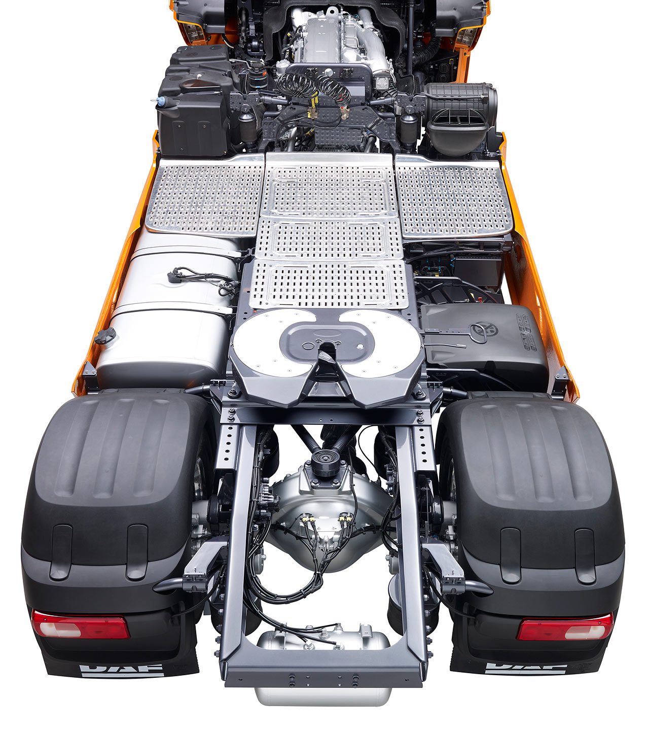 A new, lighter rear axle is available for combination weights of up to 44 tonnes and engine torques of up to 2,300 Nm. A Stabilink suspension structure incorporates the function of the anti-roll bar, reducing weight and providing a high level of stability and excellent handling. A new fifth wheel mounting plate and smart positioning of the battery boxes result in additional weight savings. The new steering gear is mounted on a multifunctional casting, eliminating the need for a separate steering box mounting bracket. The standard 90-litre AdBlue tank (140-litre tank optional) is positioned under the cab and the batteries can be positioned to the rear inside the chassis. Combining the DeNOx system and the soot filter into a single unit makes it possible to provide fuel tank capacities of up to 1,500 liters for a maximum operating range. Additional enhancements include new rear mudguards and a redesigned closing cross-member for the chassis.