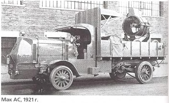 The AC series appeared in the midst of the First World War. Until the end of the war, the company Mack had sent to European countries more than 2,5 thousand trucks AC. Mostly it was 3,5 and 5 ton versions, equipped with a four-cylinder engine (7.7 liter, 40 hp), 3-speed gearbox, chain-driven rear wheels with solid tires and a frame of chrome-nickel steel. A characteristic shape of front mask was determined the location of water radiator between hood and open cab, which provided the access to the engine from three sides. Since 1917, 7.5-ton truck was produced, capable to carry light French tanks Renault FT17. Until 1920, about 4.5 thousand trucks of AC model were produced, most of which were used in the armed forces as a flatbed trucks, artillery tractors, dump trucks, repair shops, winches for balloons, etc. In 20e, 8-ton long wheelbase chassis with a generating station, located in front of the engine and serves to feed the lighting projectors was added to the range, as well as several experienced half-track trucks. Since 1929, the U.S. Army used the 8-ton trucks AP (6x6), which became the development of AC series, which were used as artillery tractors T2. The trucks got 6-cylinder 150-horsepower engine, closed cab and disk wheels with pneumatic tyres.
