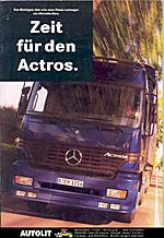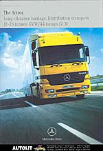 In 1996, Mercedes-Benz introduced the successor of the SK model - a new family Actros. Shapes of the truck were born as a result of close collaboration of designers and aerodynamic engineers. A windage is decreased by 17% (compared with the SK model). The trucks can be equipped with a standard cab "S" (length is 1700 mm), middle cab "M" (length is 1950 mm) and long cab "L" (length is 2200 mm). All the cabins have four points air suspension. Internal height of the "S" and "M" cabins is 1560 mm, the "L" cab has 1920 mm height. New 6- and 8-cylinder V-diesel engines of series "500" were developed specially for the Actros. The six-cylinder 12 liters engine has an output from 313 to 428 hp, and the eight-cylinder 16 liters engine has an output from 471 to 571 hp. These engines have low fuel consumption and high environmental safety. The chassis is produced in two-, three- and four-axles versions. Wheelbase is from 3300 to 6300 mm. Lightweight and durable frame is very handy for mounting of different bodies. An air suspension of front and rear axles reduces can change clearance of the vehicle. It is possible to offer a suspension on parabolic springs with stabilizer bars. A manual gearbox has 16 speeds. An automatic transmission can be offered also. Steering is equipped with a powerful booster and the steering angle of wheel is up to 48°. The original brake system is equipped with ABS and traction control systems, and together with ventilated disc brakes on all wheels and electronic control can reduce stopping distance by 20 m, compared with ordinary trucks. Gross weight of a single truck is 18 - 25 tons, gross combination vehicle weight is up to 40 tons. In 1997 the truck received the prestigious award "Truck of the Year 1997". Since the autumn of 1997 a construction series of Actros has been produced. Thickness of the frames depends on the load and can be 7.8 mm or 9 mm. Batteries, wiring and connectors are protected by sealed enclosures. Wheelbase is from 3300 to 5100 mm. The construction Actros trucks can be equipped with the same engines as the road versions. A front suspension for two and three-axle trucks is spring or pneumatic, rear suspension is on parabolic leaf springs with rubber bushings fixing to the frame. Manual gearboxes have a hydro-pneumatic actuator switch. Dump trucks with the wheel configuration of 4x2 are equipped with front disc brakes. Multiaxial and all-wheel-drive versions have only drum brakes. Totally the construction range includes 33 basic models.